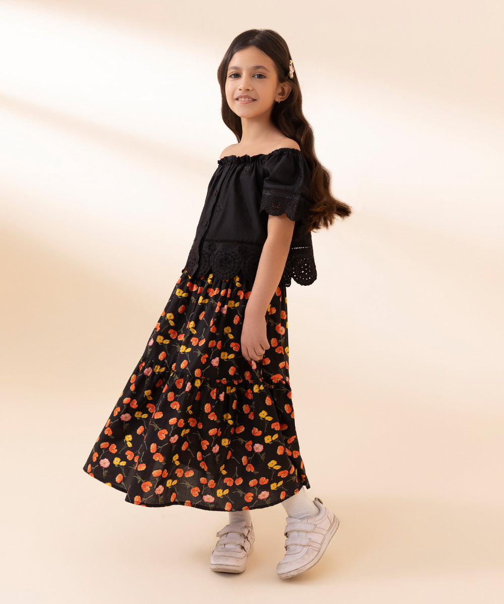 Make your little princess stand out in our black embroidered top paired with a printed, floral tiered skirt.