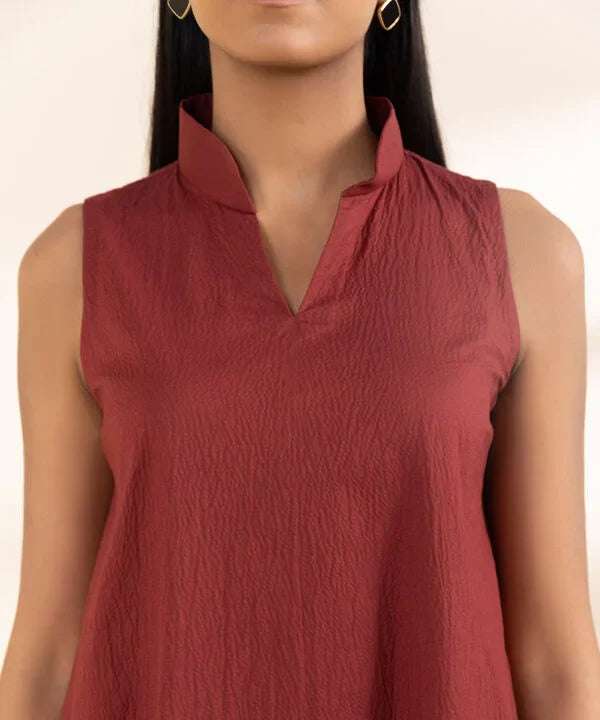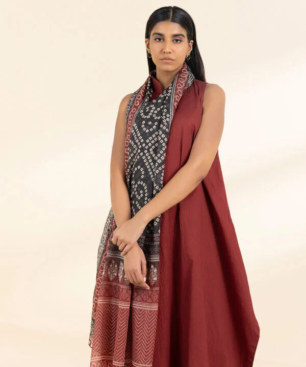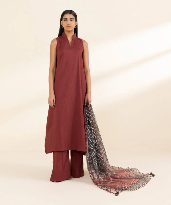 Make a statement with our three-piece ensemble in maroon and black featuring a dyed seersucker shirt and trousers paired with a printed blended tissue dupatta.