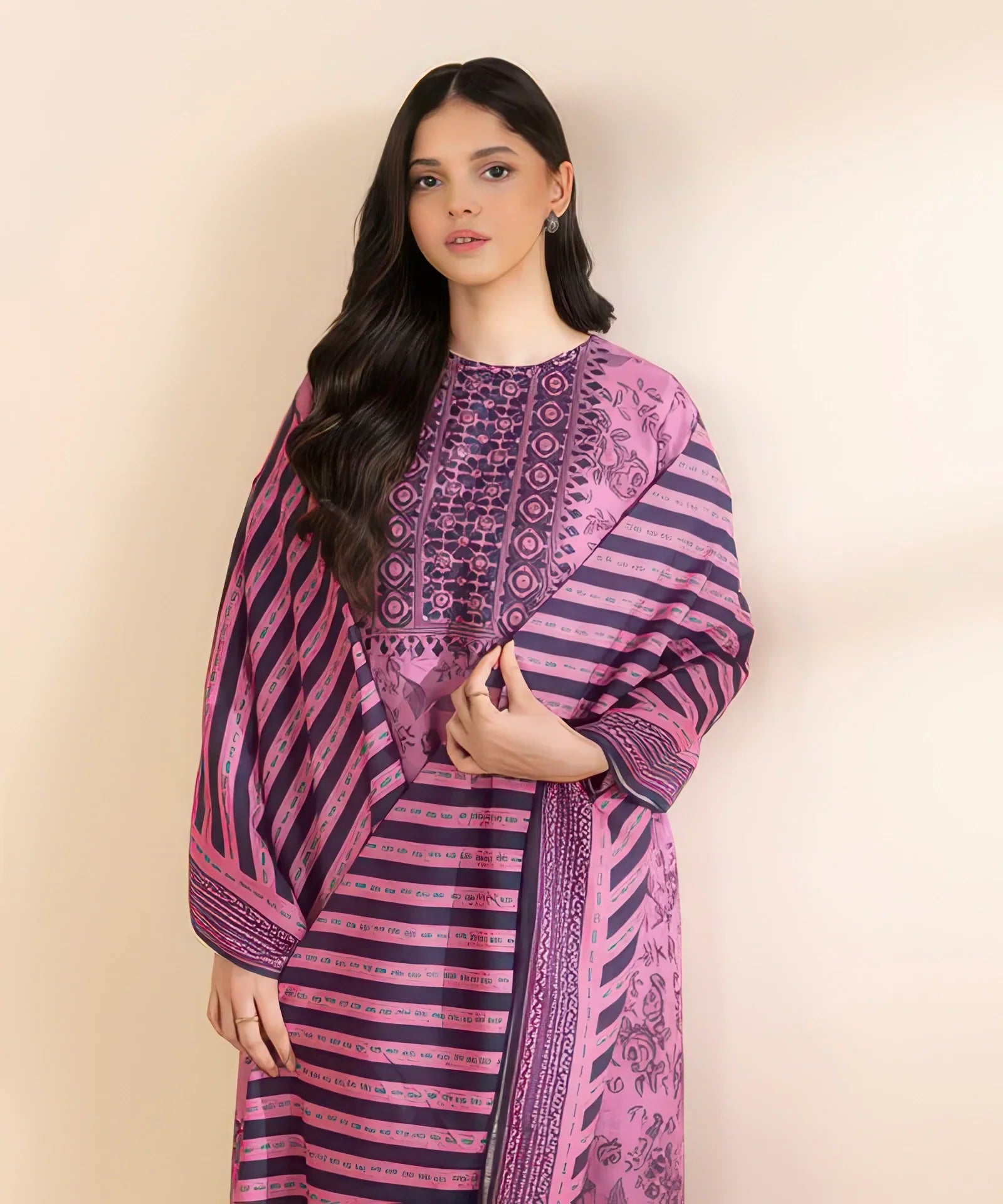 Elevate your everyday style in our dull pink three-piece featuring cambric shirt, trousers, and voile dupatta.