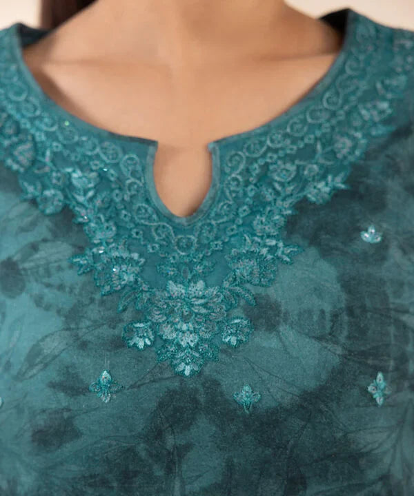 Make a statement with our three-piece embroidered ensemble in teal blue featuring a cotton shirt and trouser paired with a matching manar dupatta.