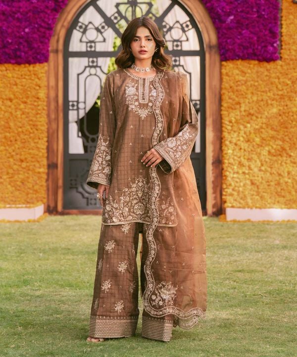 Make the perfect festive statement with our three-piece ensemble in brown featuring a dyed tilla embroidered shirt with a round neckline and a slit paired with wide culottes and a blended organza dupatta.
