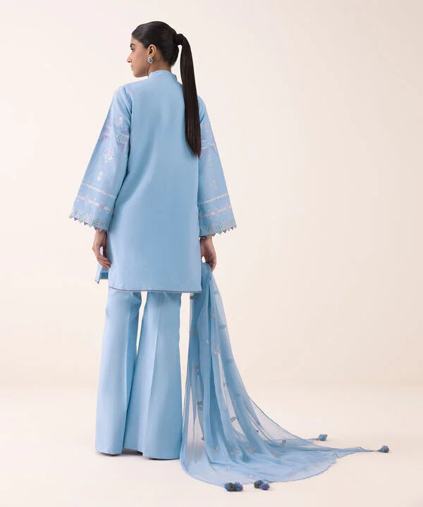 Make a statement with our three-piece embroidered blue ensemble featuring a dobby shirt paired with a crinkle chiffon dupatta and cotton trousers.