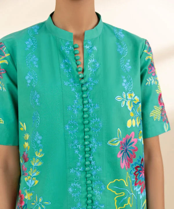 Make a statement with our three-piece embroidered green ensemble featuring a lawn shirt paired with a blended chiffon dupatta and dyed cotton trousers.