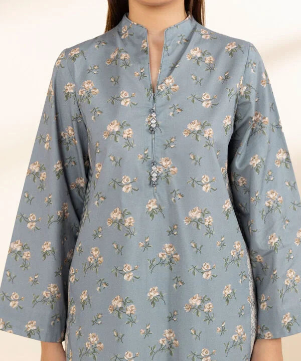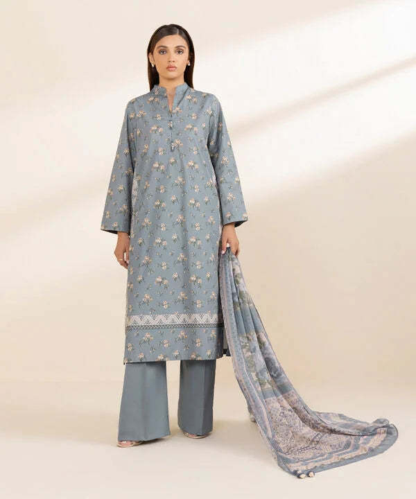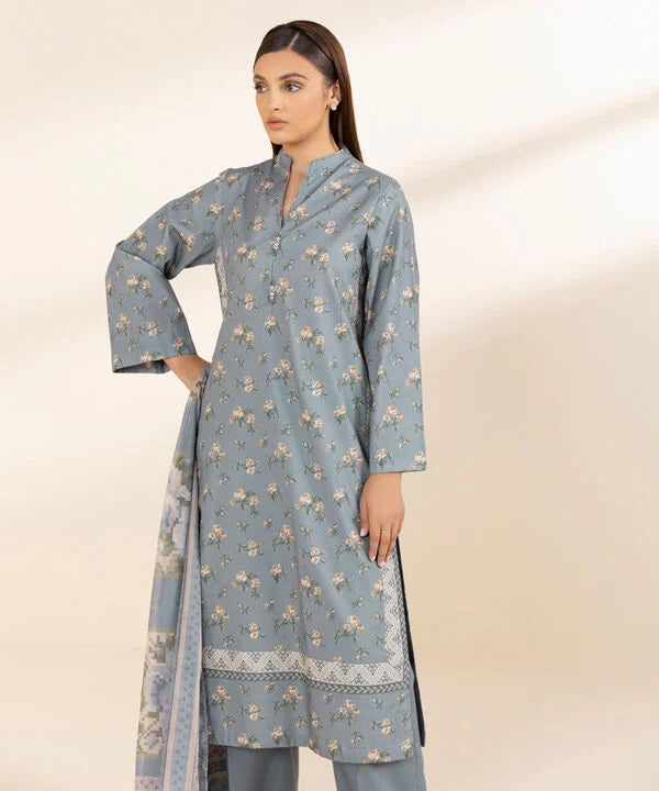 Elevate your style with our three-piece printed ensemble in powder blue featuring a cotton shirt and trousers paired with a blended tissue dupatta.