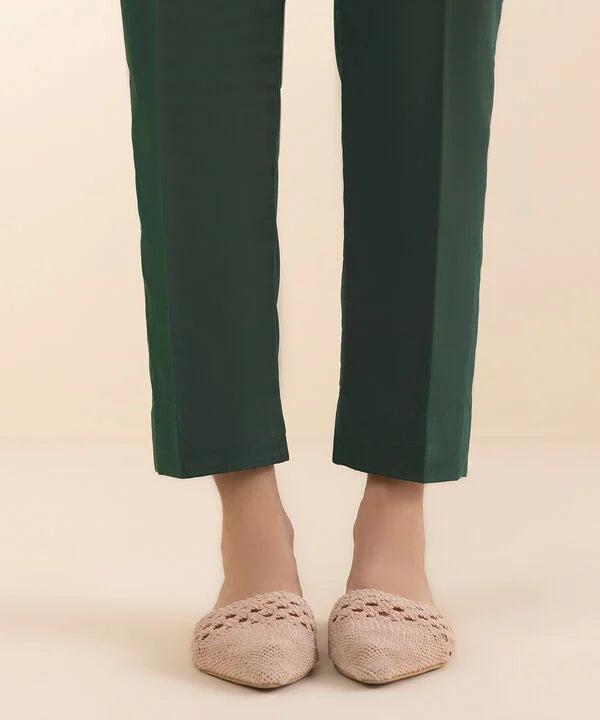 Refresh your wardrobe with our three-piece printed ensemble in dark green featuring a lawn shirt, dyed cotton trousers and a matching voile dupatta.