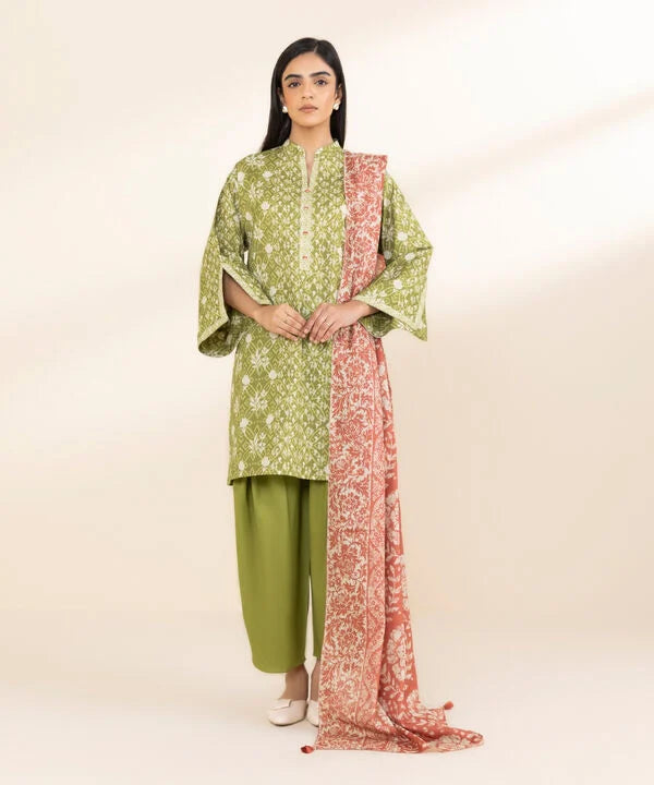 Elevate your seasonal wardrobe with our printed parrot green and dark pink, lawn three piece suit with a textured voile dupatta and cotton trousers.