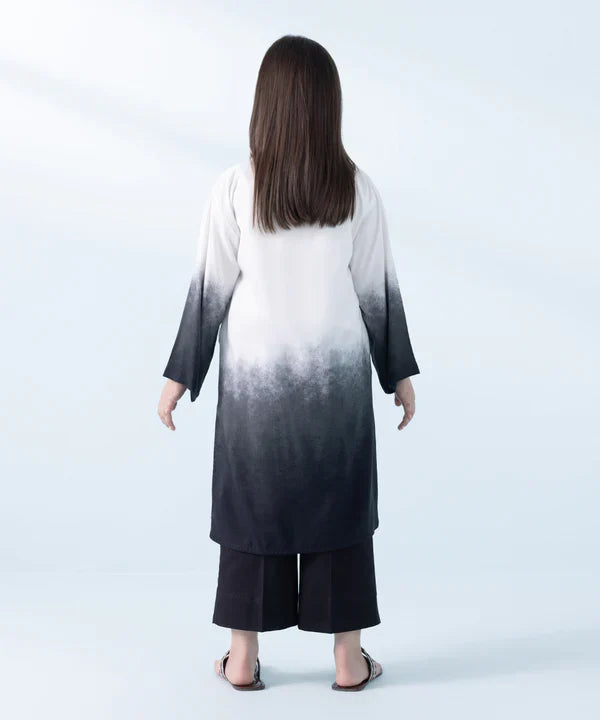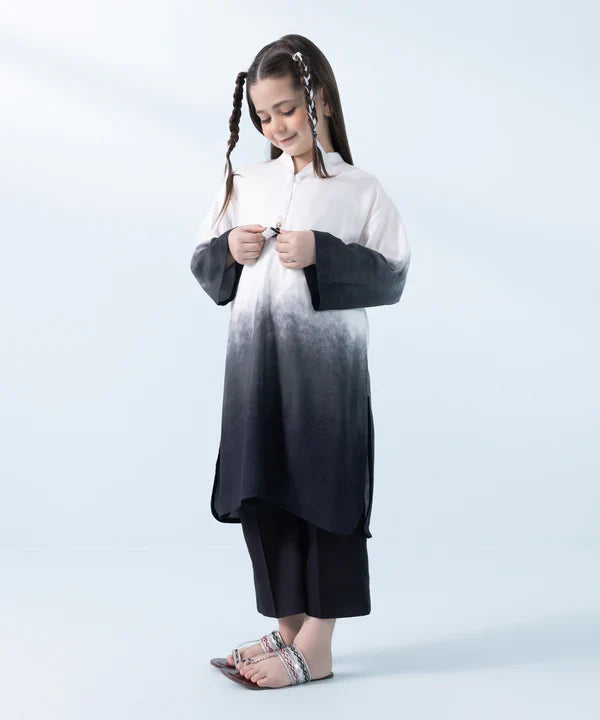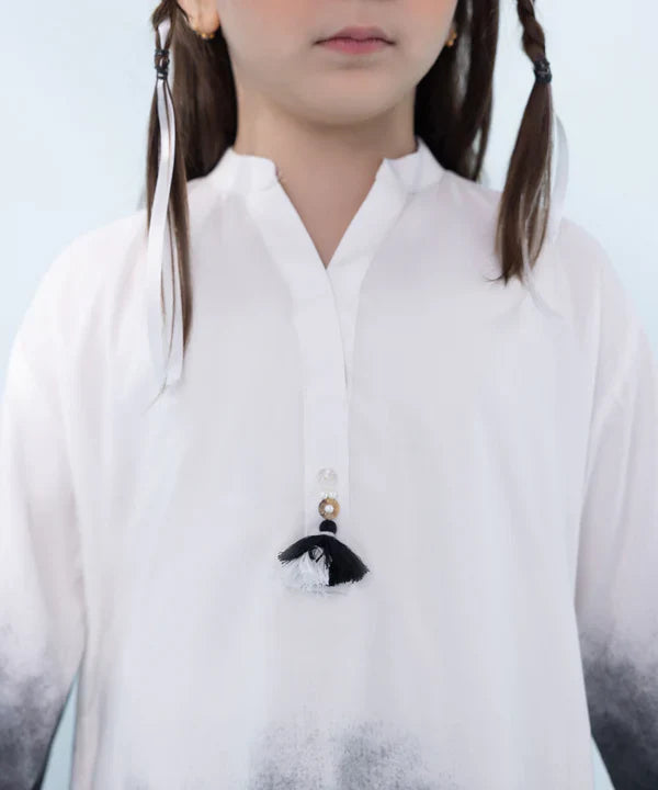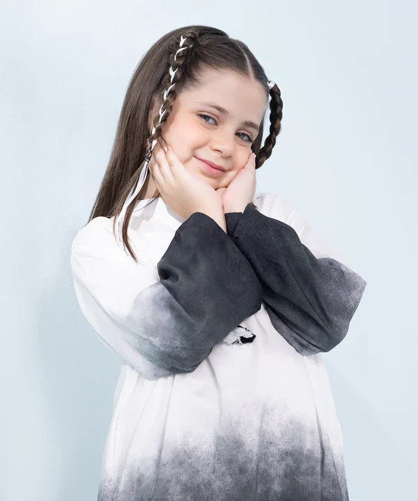 Make your little one stand out with our loose-fit long tie and dye arabic lawn shirt with placket detailing in white.