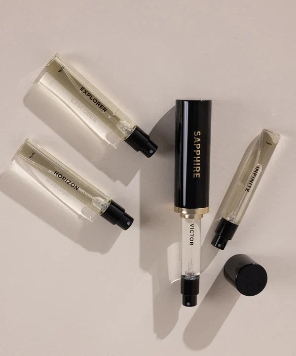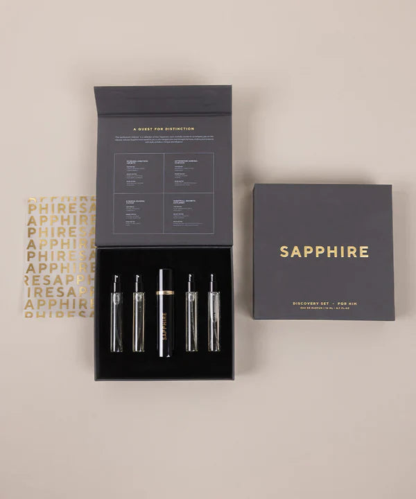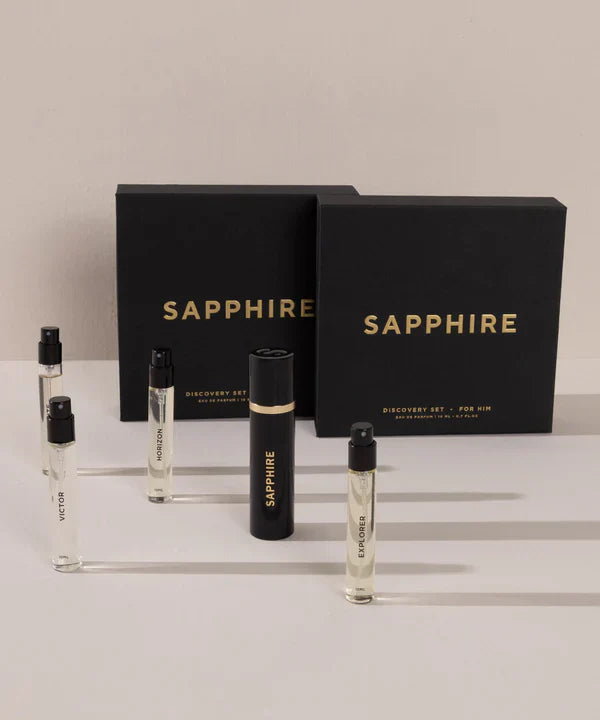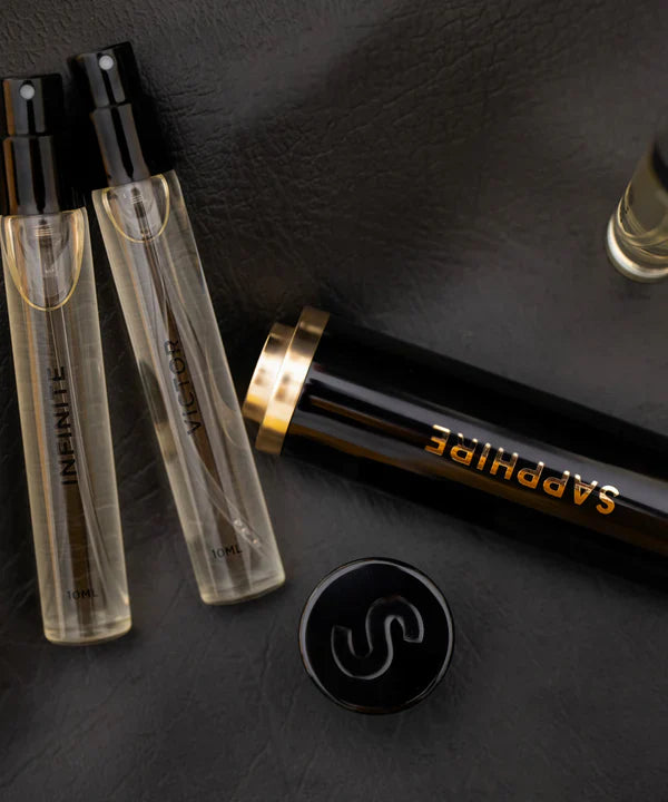 Discover SAPPHIRE's best-selling fragrances for men in this limited edition set, elegantly packaged in a gift box. Experience the invigorating notes of citrus grapefruit and lemon, complemented by the rich warmth of plum, capturing a bold essence that embodies confidence and sophistication. This set contains: Infinite10ml Horizon 10ml Victor 10ml Explorer 10ml Black Traveling Case