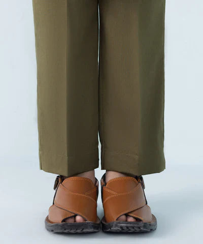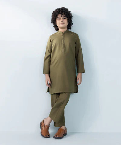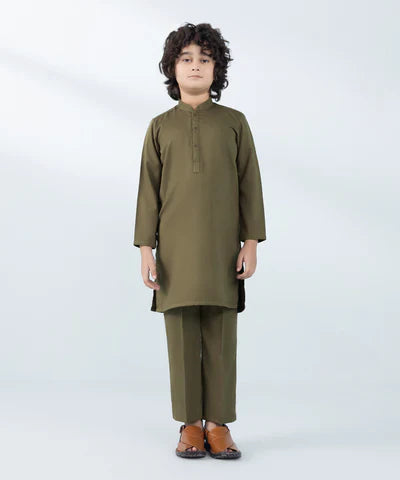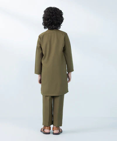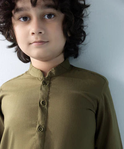 Dress your little boy in our dobby solid olive green suit including a straight shirt and trousers.