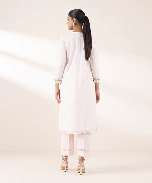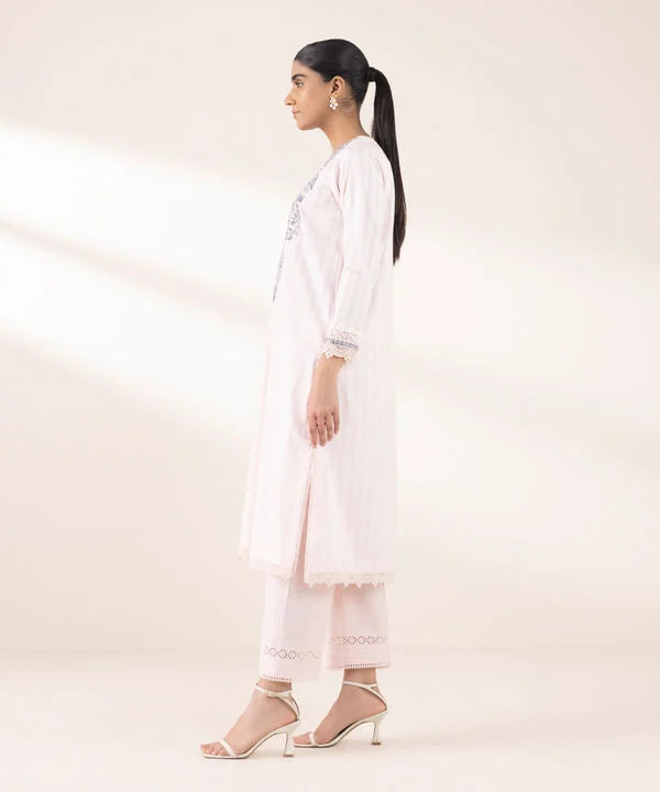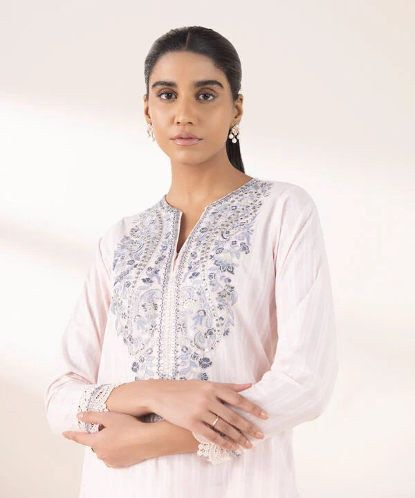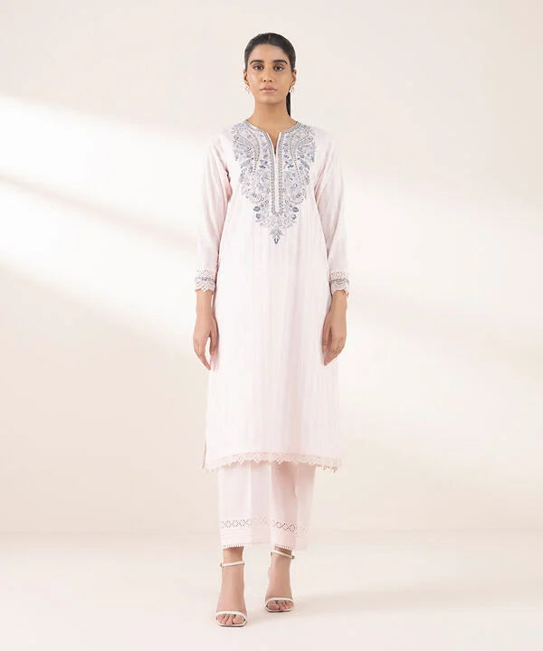 Perfect your festive style with our pink dyed embroidered A-line shirt featuring a round neckline with a slit.