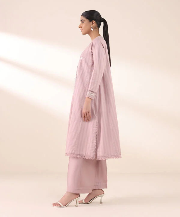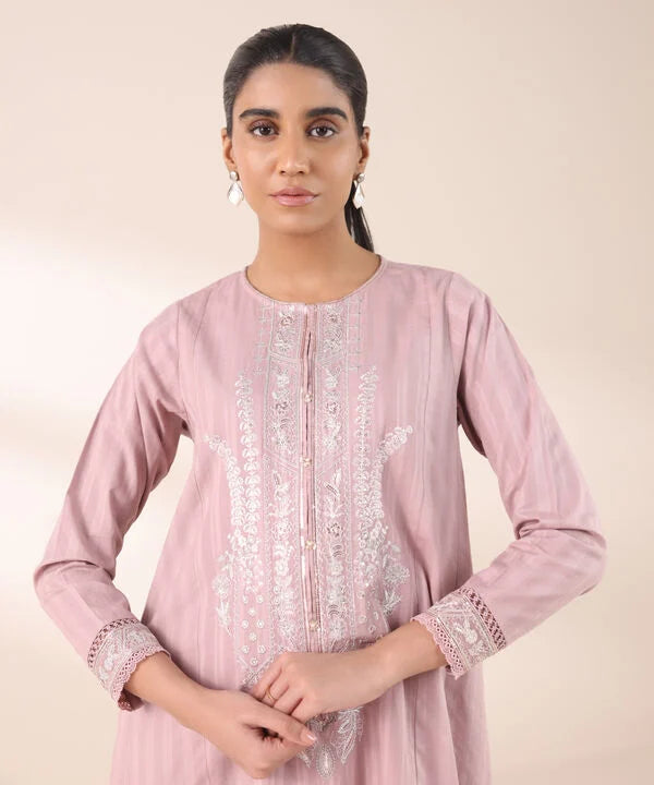 Perfect your festive style with our dyed tea pink embroidered A-line shirt featuring a round neckline with a slit.