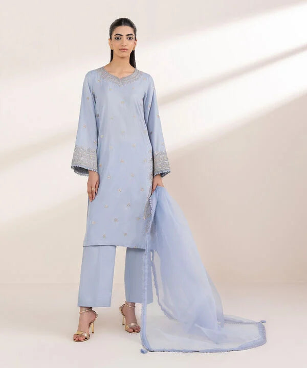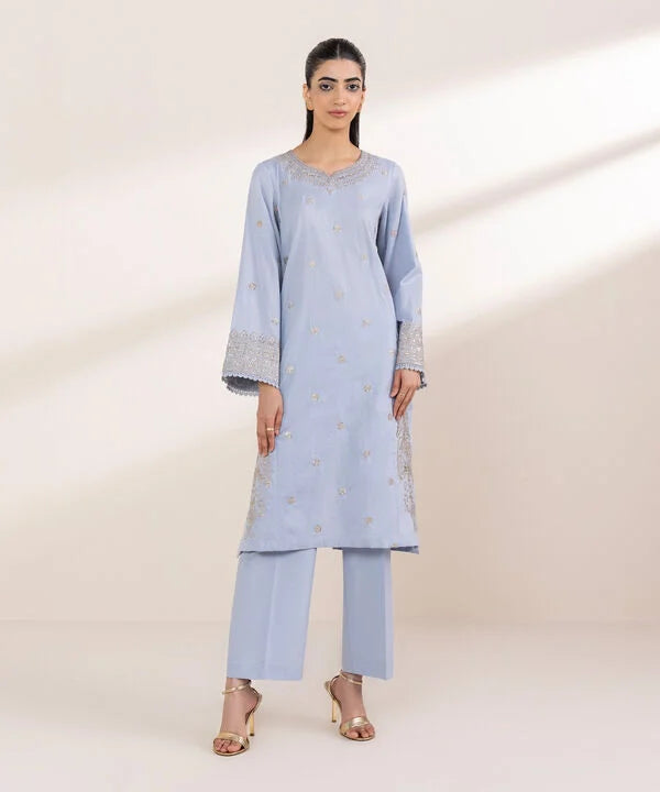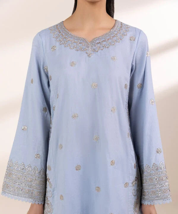 Step out in style in our embroidered blue dobby panelled A-line shirt with a round neckline and slit.