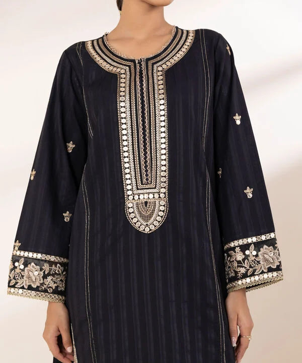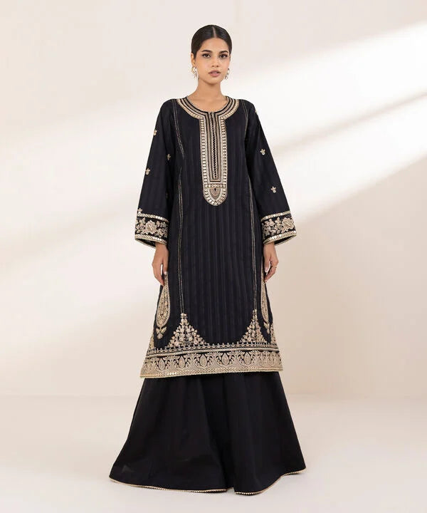 Perfect your festive style with our dyed black, tilla embroidered A-line shirt featuring a round neckline with a slit.
