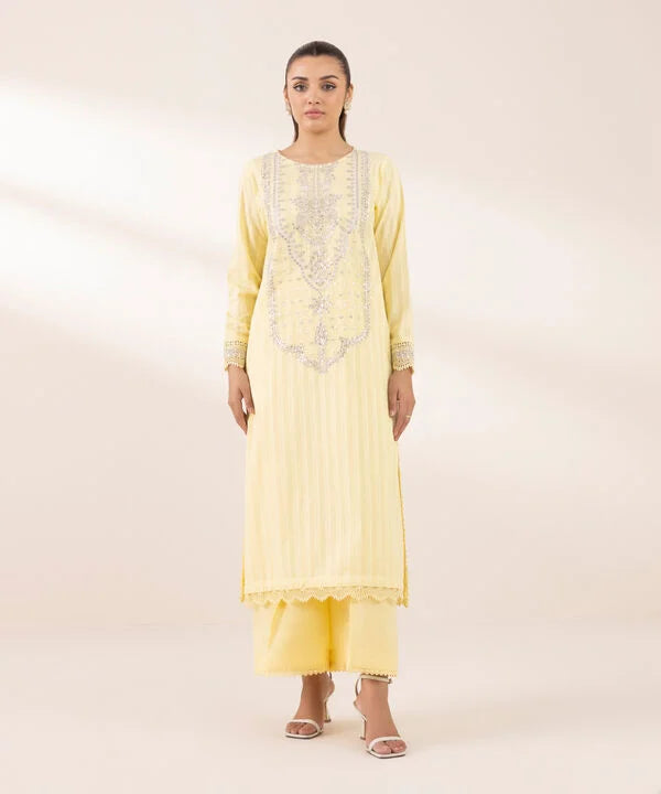 Make heads turn this festive season with our yellow, dyed embroidered A-line shirt featuring a round neckline.