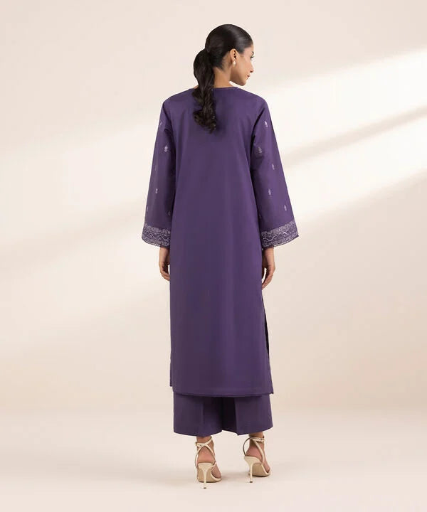 Step out in style in our embroidered purple lawn A-line shirt with a round neckline and slit.