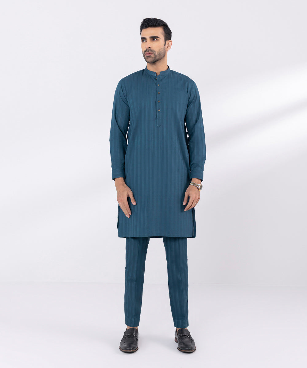 Elevate your everyday style in our blue cotton dobby straight kurta and trouser.