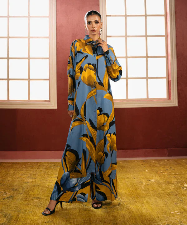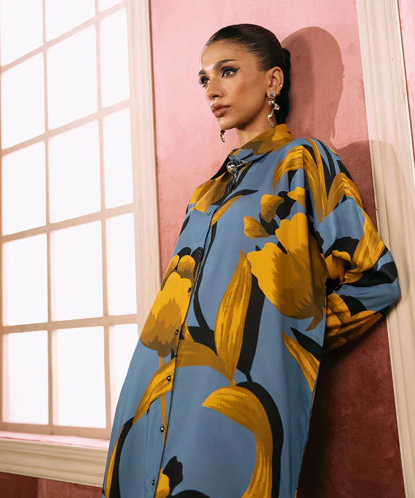 Elevate your winter style with our mustard printed straight button down linen shirt, featuring a collared neckline with a placket.